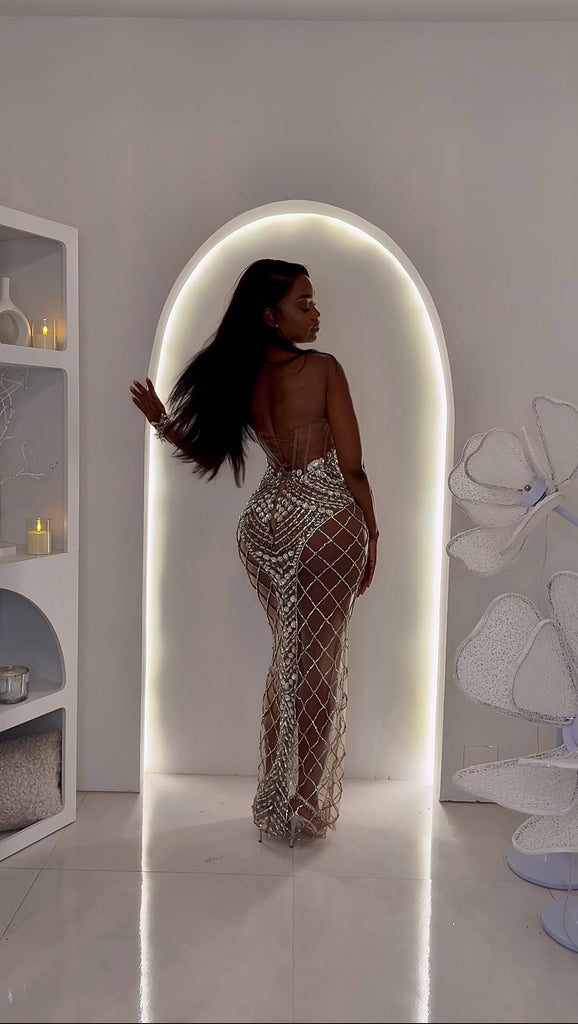 1. This dress is custom created from scratch. It is not Stocked. This gorgeous dress is guaranteed to leave eyes looking. Dripping in hundreds of hand laid crystals on stunning skin toned fabric. Glistens like a dream and hugs the body like a glove, material does not stretch but has a little give. What you see is what you get, please view my instagram to see this dress in action @kayturestylings...