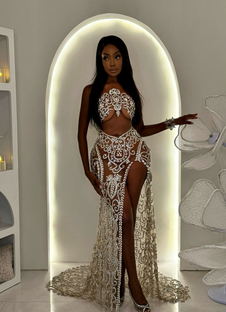 1. This dress is custom created from scratch. It is not Stocked. This gorgeous dress is guaranteed to leave eyes looking. Dripping in hundreds of hand laid crystals on stunning skin toned fabric. Glistens like a dream and hugs the body like a glove, material does not stretch but has a little give. What you see is what you get, please view my instagram to see this dress in action @kayturestylings...